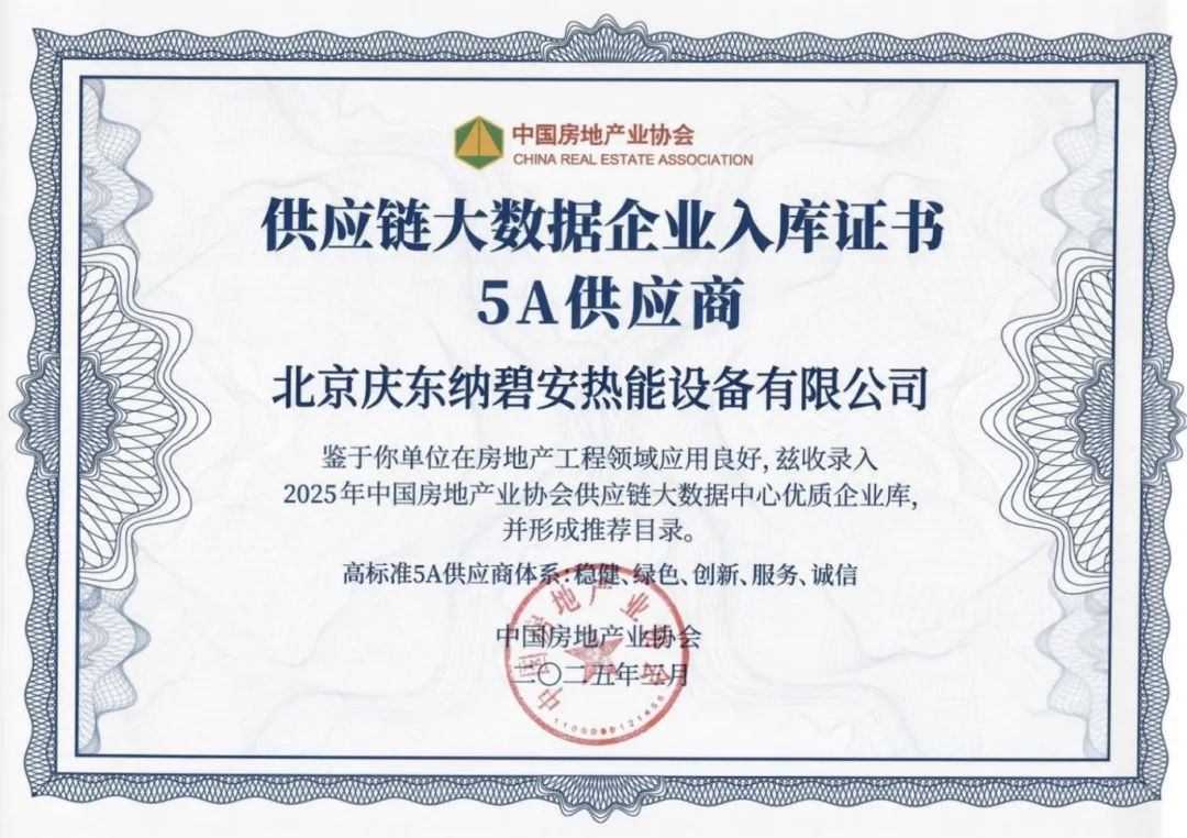 同步收录于中国房地产业协会供应链大数据中心“高标准5A供应商企业库”,也代表着庆东纳碧安在“稳健、绿色、创新、服务、诚信”五大维度上的综合能力获权威认可。