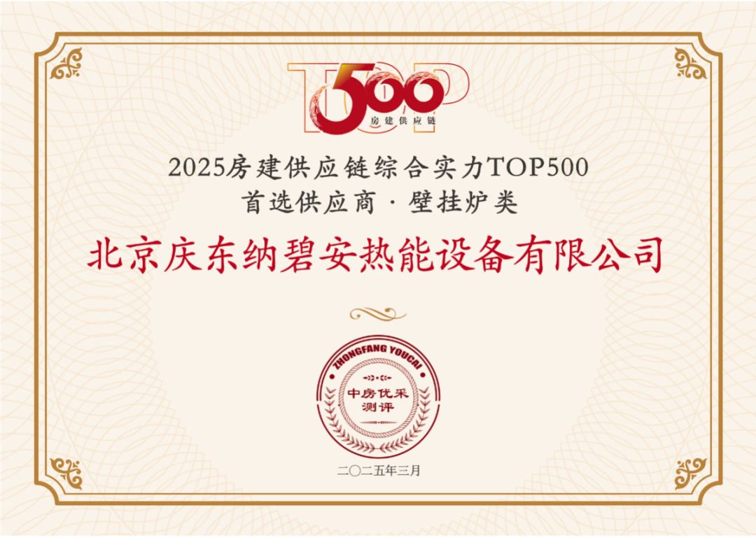 2025年3月19日,由中国房地产业协会、上海易居房地产研究院联合主办的“2025房建供应链企业综合实力TOP500测评成果发布会”于北京盛大举行。庆东纳碧安凭借长期在热能领域的技术深耕与优异表现,再次荣膺“TOP500首选品牌·壁挂炉类”荣誉称号,并同步入选中国房地产业协会供应链大数据中心“高标准5A供应商企业库”。
